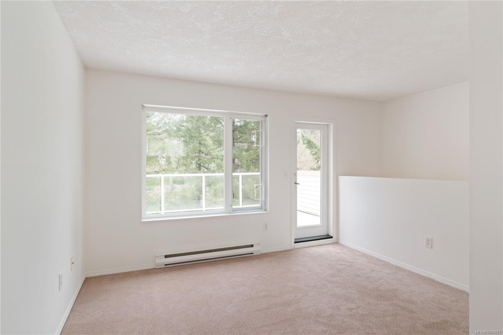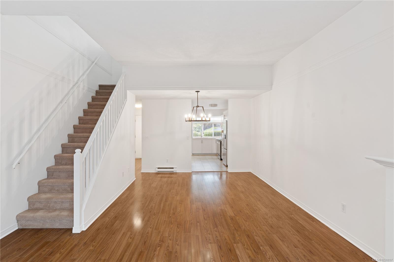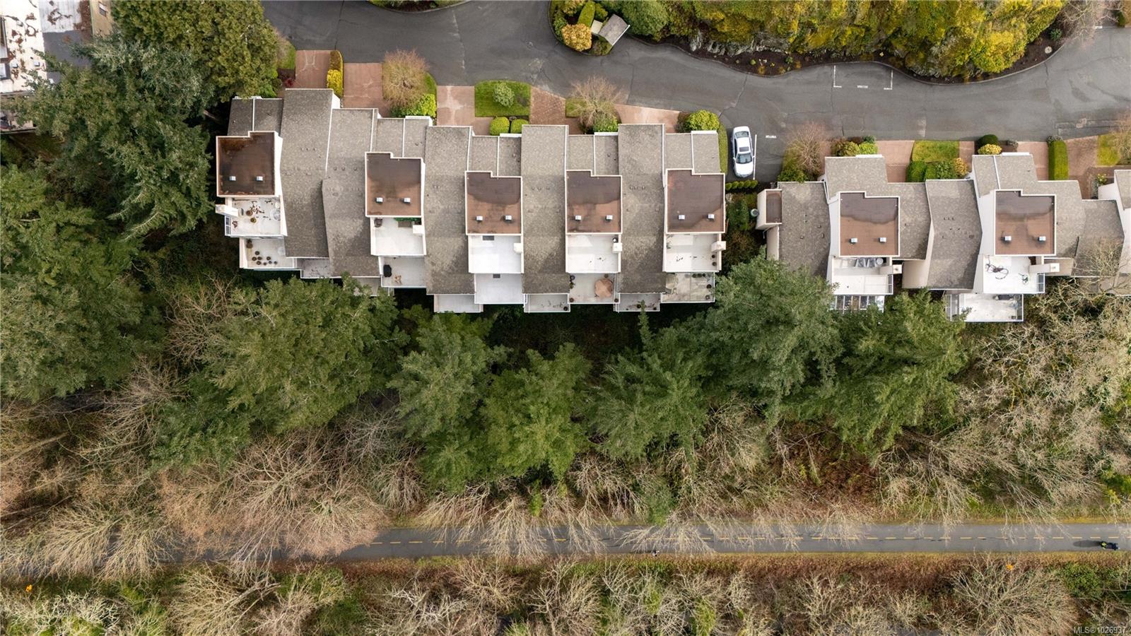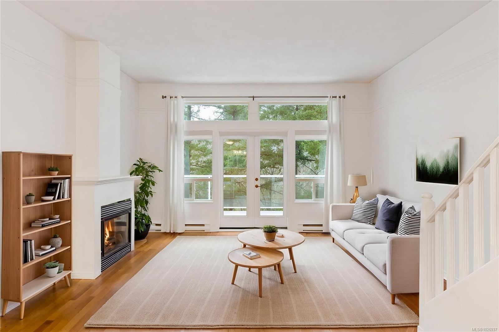 Welcome to this beautifully updated home offering nearly 2,000 sqft of thoughtfully designed living space in a quiet, private setting backing onto forest and the Galloping Goose Trail. The main level features an open-concept layout with soaring 10' ceilings, a cozy gas fireplace, and a stunning new kitchen with quartz countertops and Fisher & Paykel fridge and freezer. Step out to the expansive deck to enjoy peaceful treed views. The primary bedroom on the main floor allows for easy living. Upstairs offers a bright, versatile flex space with its own private deck, ideal for a home office or lounge. The lower level provides excellent flexibility with a large rec room, spacious bedroom, full bathroom, storage, and an additional large deck. Updated flooring, brand new carpets, three generous decks and a garage complete the home. Ideally located near trails, Swan Lake, and all amenities.