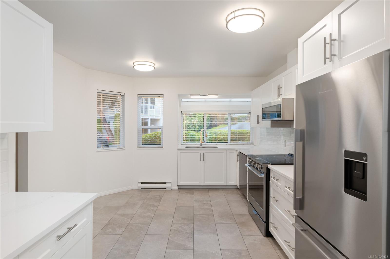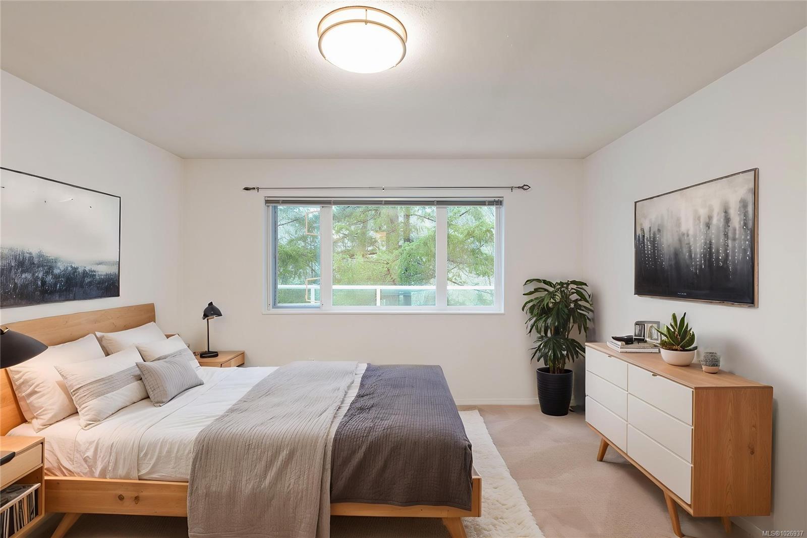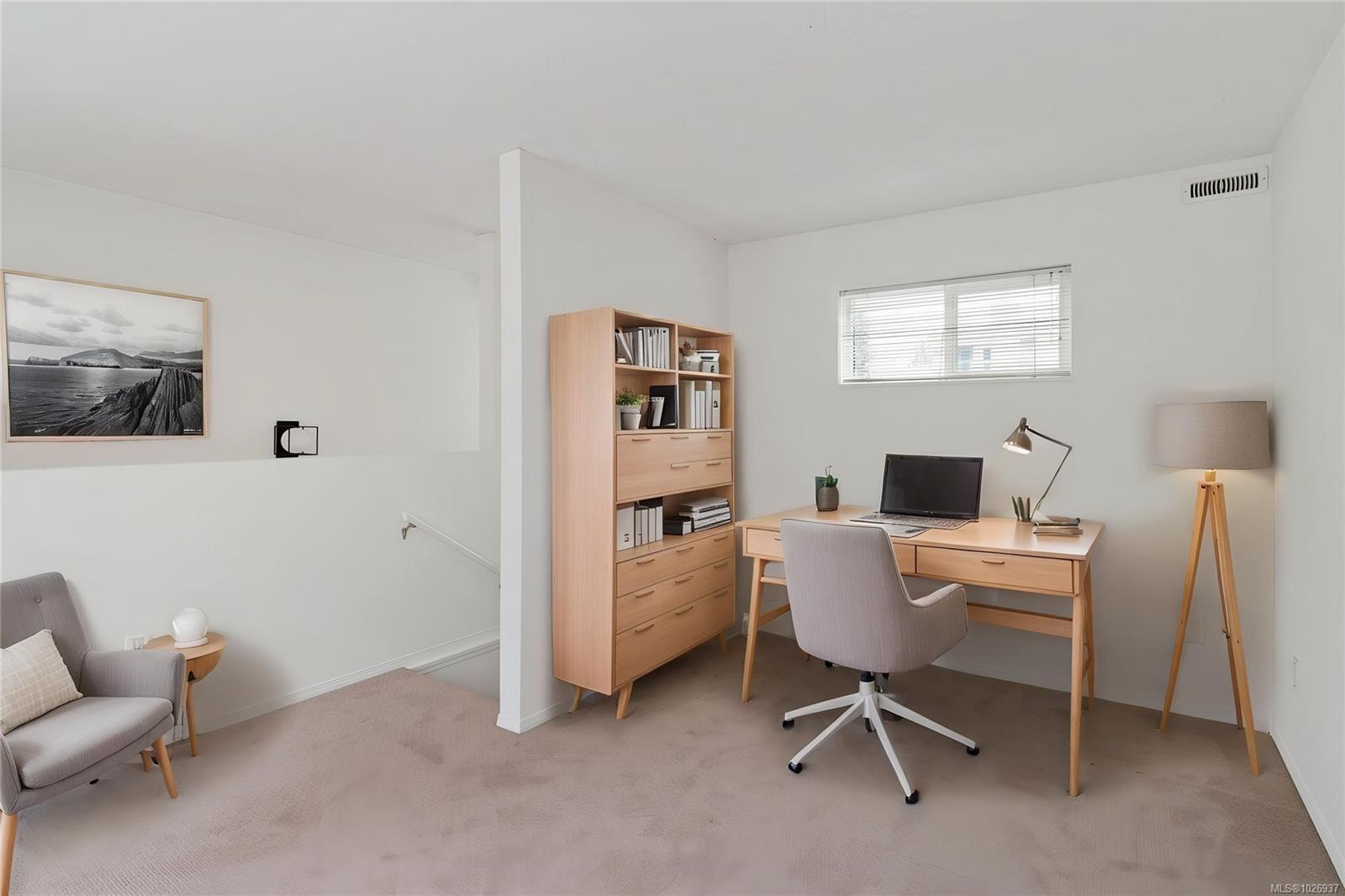 Welcome to this beautifully updated home offering nearly 2,000 sqft of thoughtfully designed living space in a quiet, private setting backing onto forest and the Galloping Goose Trail. The main level features an open-concept layout with soaring 10' ceilings, a cozy gas fireplace, and a stunning new kitchen with quartz countertops and Fisher & Paykel fridge and freezer. Step out to the expansive deck to enjoy peaceful treed views. The primary bedroom on the main floor allows for easy living. Upstairs offers a bright, versatile flex space with its own private deck, ideal for a home office or lounge. The lower level provides excellent flexibility with a large rec room, spacious bedroom, full bathroom, storage, and an additional large deck. Updated flooring, brand new carpets, three generous decks and a garage complete the home. Ideally located near trails, Swan Lake, and all amenities.