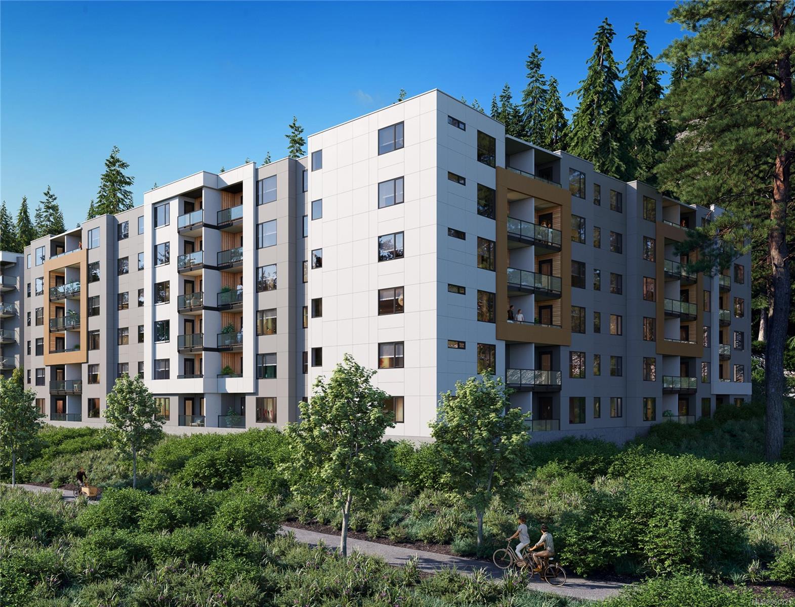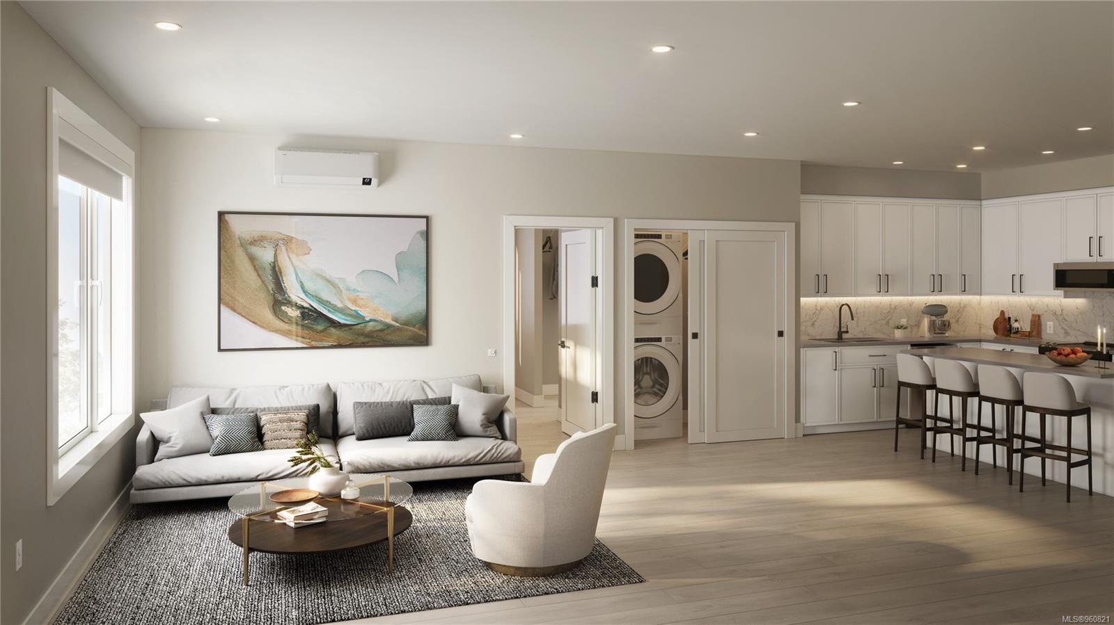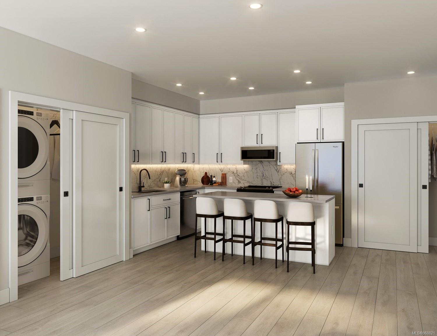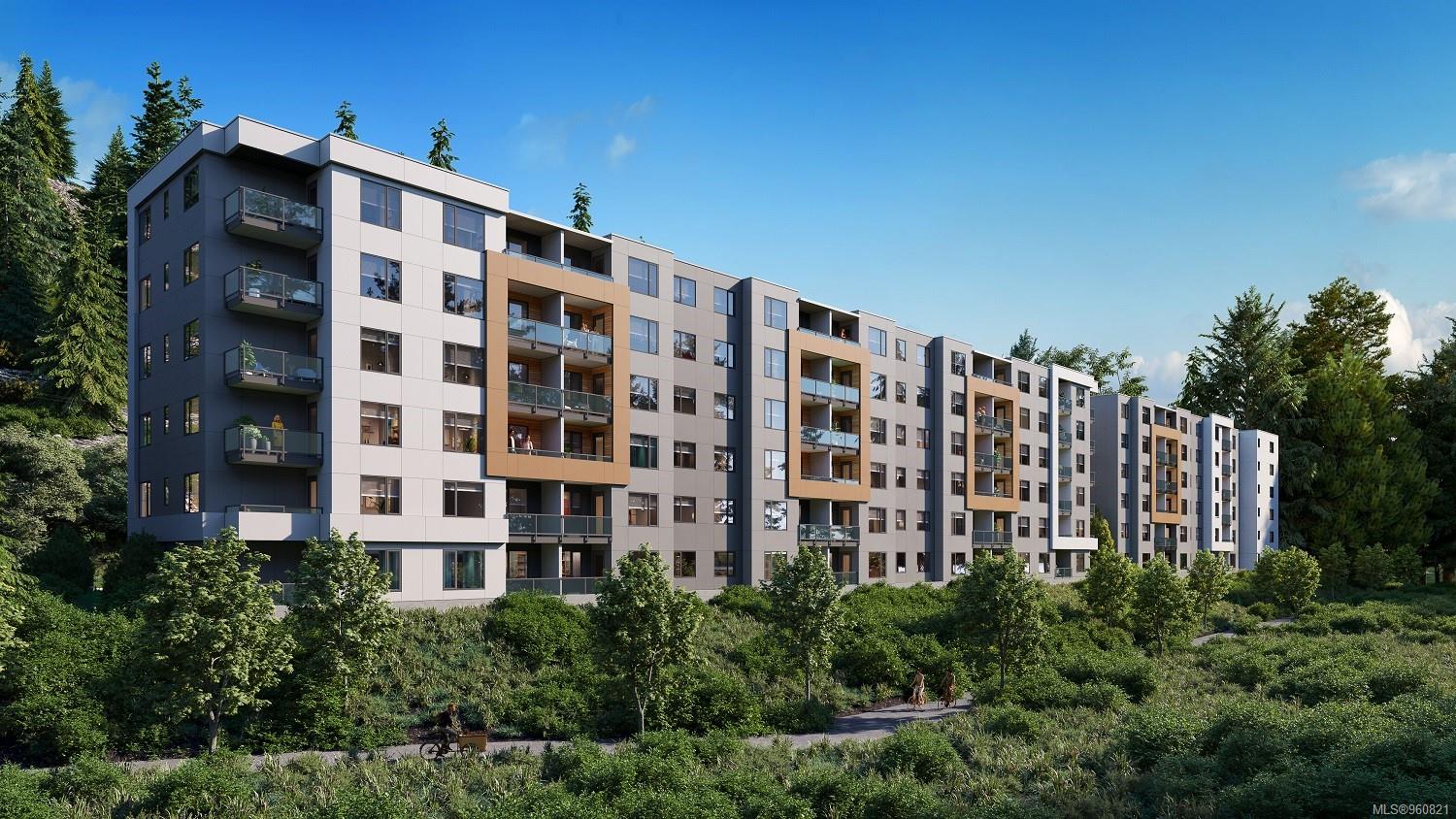 Move in this year and enjoy the premier top floor lake and mountain views from the deck or living room in our largest 2 bed 2 bath unit! 'Trailside at the Lake' is an idyllic new condo poised on the shores of Langford Lake equipped with all the amenities for modern living. Transit at your doorstep, the homes are bright and airy including large windows to showcase the scenery. 9 ft ceilings, laminate flooring, spacious kitchen with quartz counters, breakfast bar, and a Whirlpool appliance package. The unit has A/C and 1 secured (EV ready) parking space, as well as a storage locker on the floor. Building amenities include a gym, yoga space, lounge & work from home office space. Just steps to the Ed Nixon trail and Langford Lake for all your outdoor adventures. View the show suite & building by appointment.