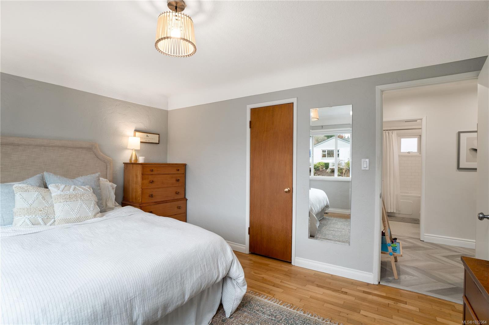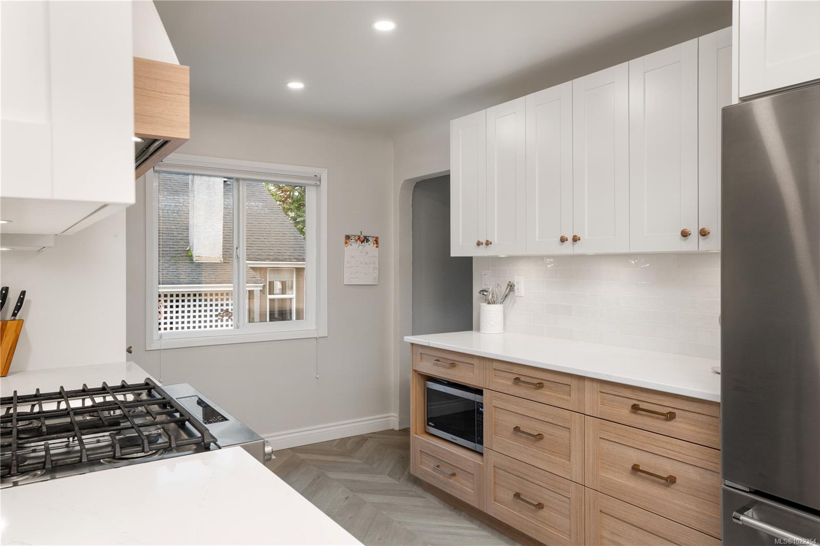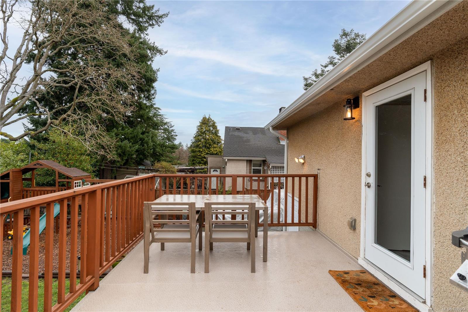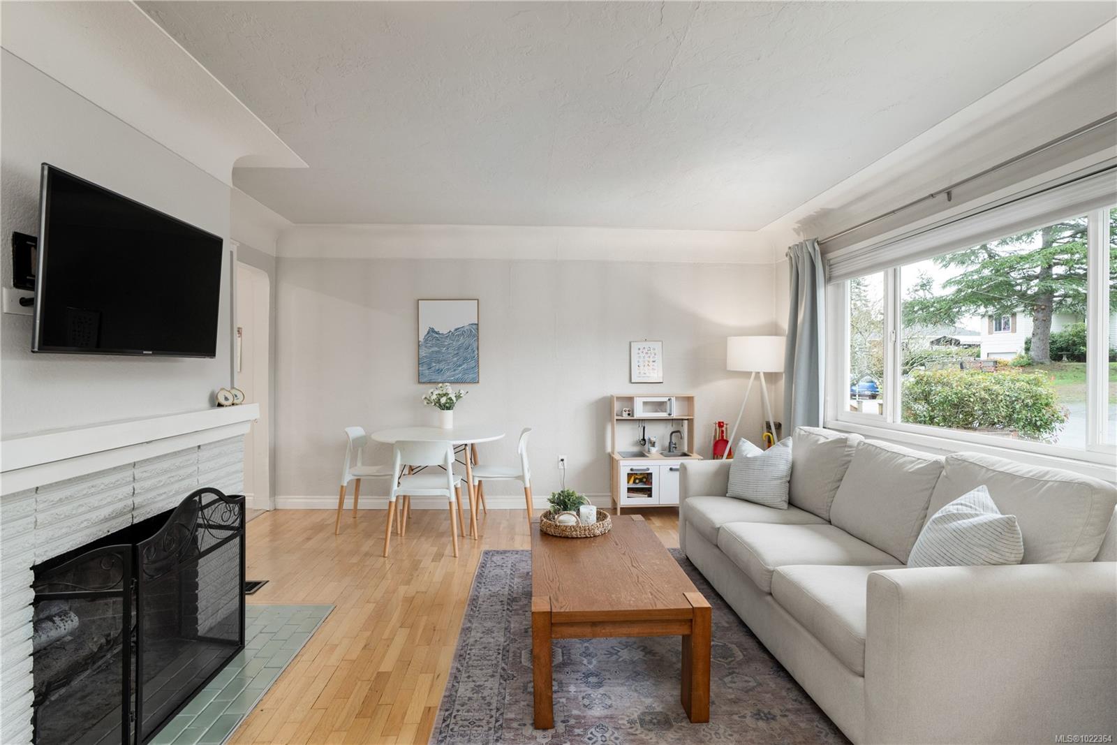 Meticulously maintained, beautifully updated & tucked away on a quiet Saanich street. Full of charm and thoughtful upgrades step inside to enjoy the stunning new kitchen (2022), warm hardwood floors, coved ceilings, & a freshly updated bathroom that blends timeless character with modern comfort. The main level offers a charming living space, 2 bedrooms and a four-piece bath, while the bright kitchen opens directly onto the deck with a BBQ gas hook up, perfect for entertaining and enjoying the spacious backyard. Downstairs, you'll find a finished bedroom plus over 700sf of unfinished space, offering endless potential for additional living area, a suite, or workspace. Major updates include perimeter drain replacement (2020), gas furnace (2019), gutters, downspouts, fascia & HWT (2025). Completing the home are 2 driveways, providing excellent parking for multiple vehicles, an RV/boat. Centrally located this is a fantastic opportunity in a highly convenient yet peaceful Saanich location.