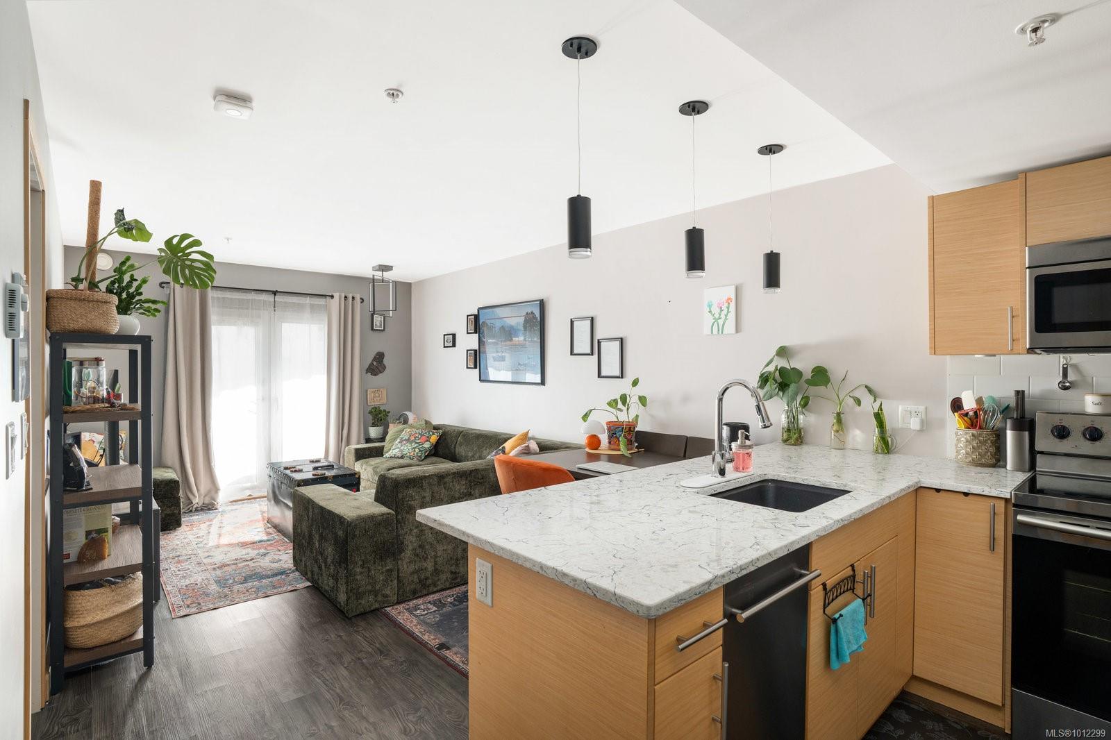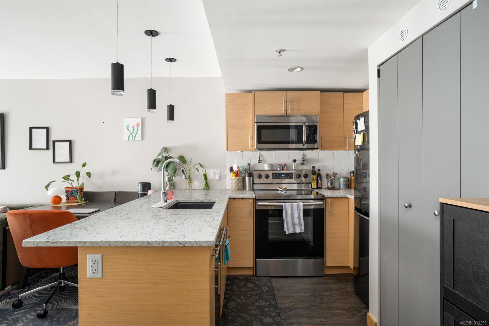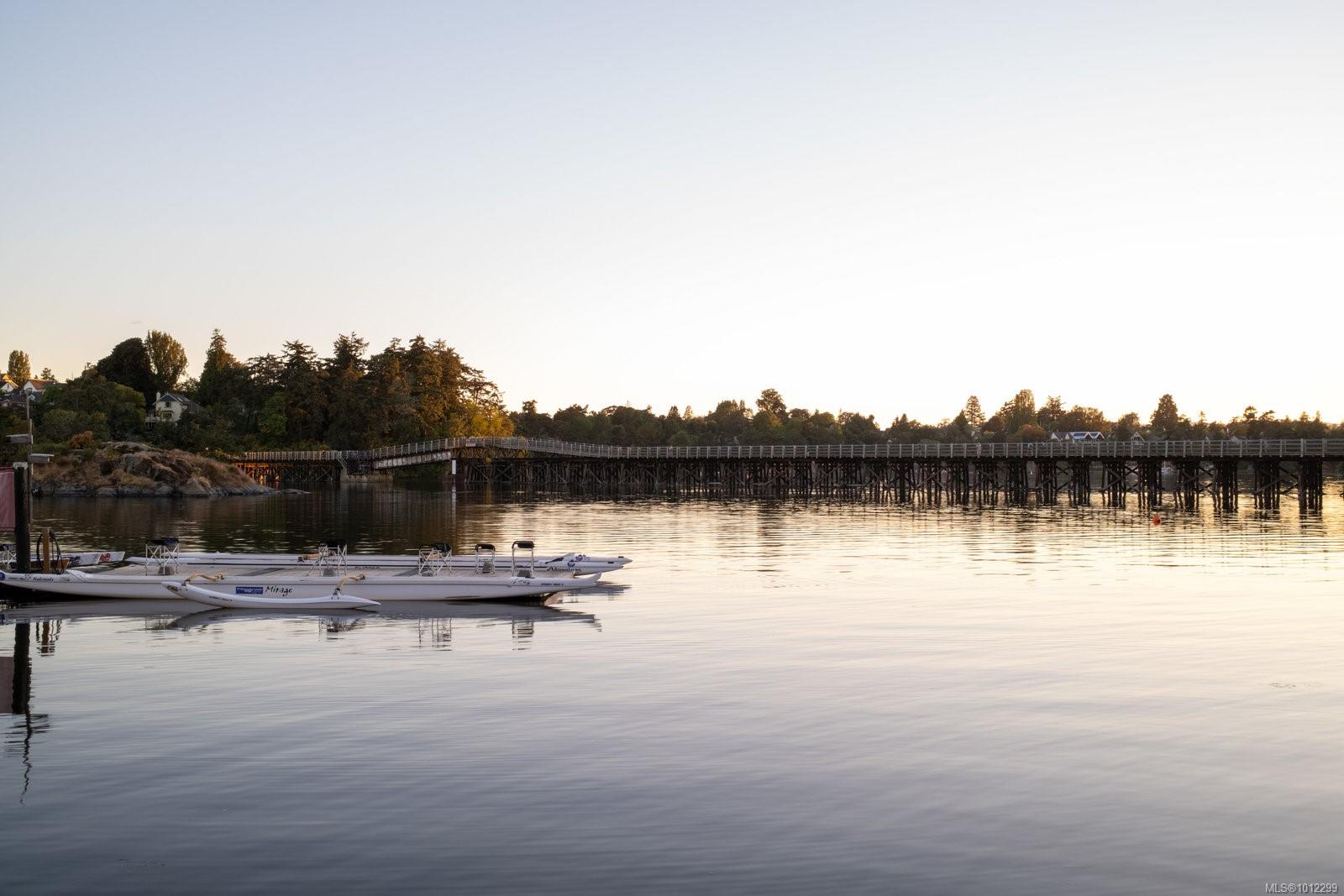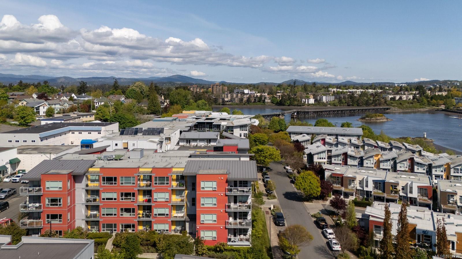Welcome to the Railyards, one of Victoria's most sought-after waterfront communities. Nestled along the Gorge Waterway and Galloping Goose Trail, this 1-bedroom condo is a dream for outdoor enthusiasts. The condo's open concept layout features numerous upgrades, including LED lighting throughout, vinyl plank flooring, quartz kitchen countertops, bathroom vanity and both new carpet and Kendal dual direction fan/light combo in the bedroom. The spacious blended living/dining room offers great natural light, while the generous bedroom includes a cheater door to access the bathroom, featuring a relaxing soaker tub. Additional perks include in-suite laundry, a storage locker, and bicycle storage. Pet friendly, rental friendly, and just a short walk to downtown, this home offers the perfect mix of tranquility and urban access in one of Victoria's best locations.