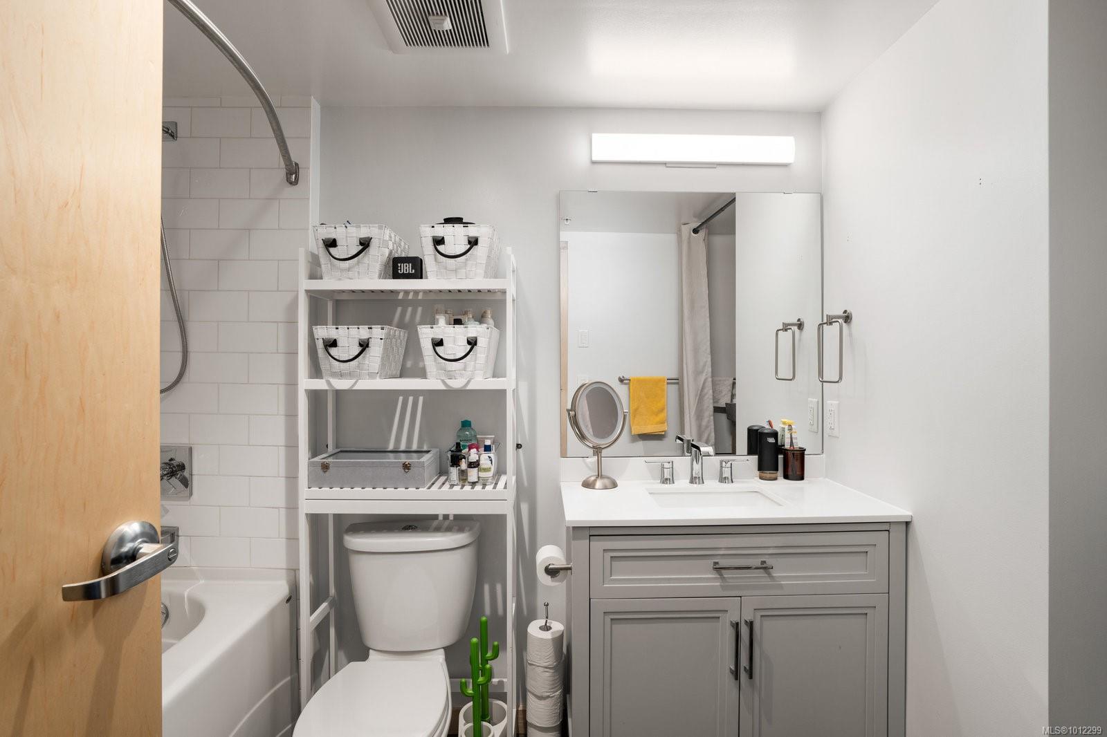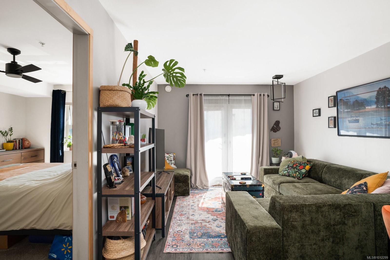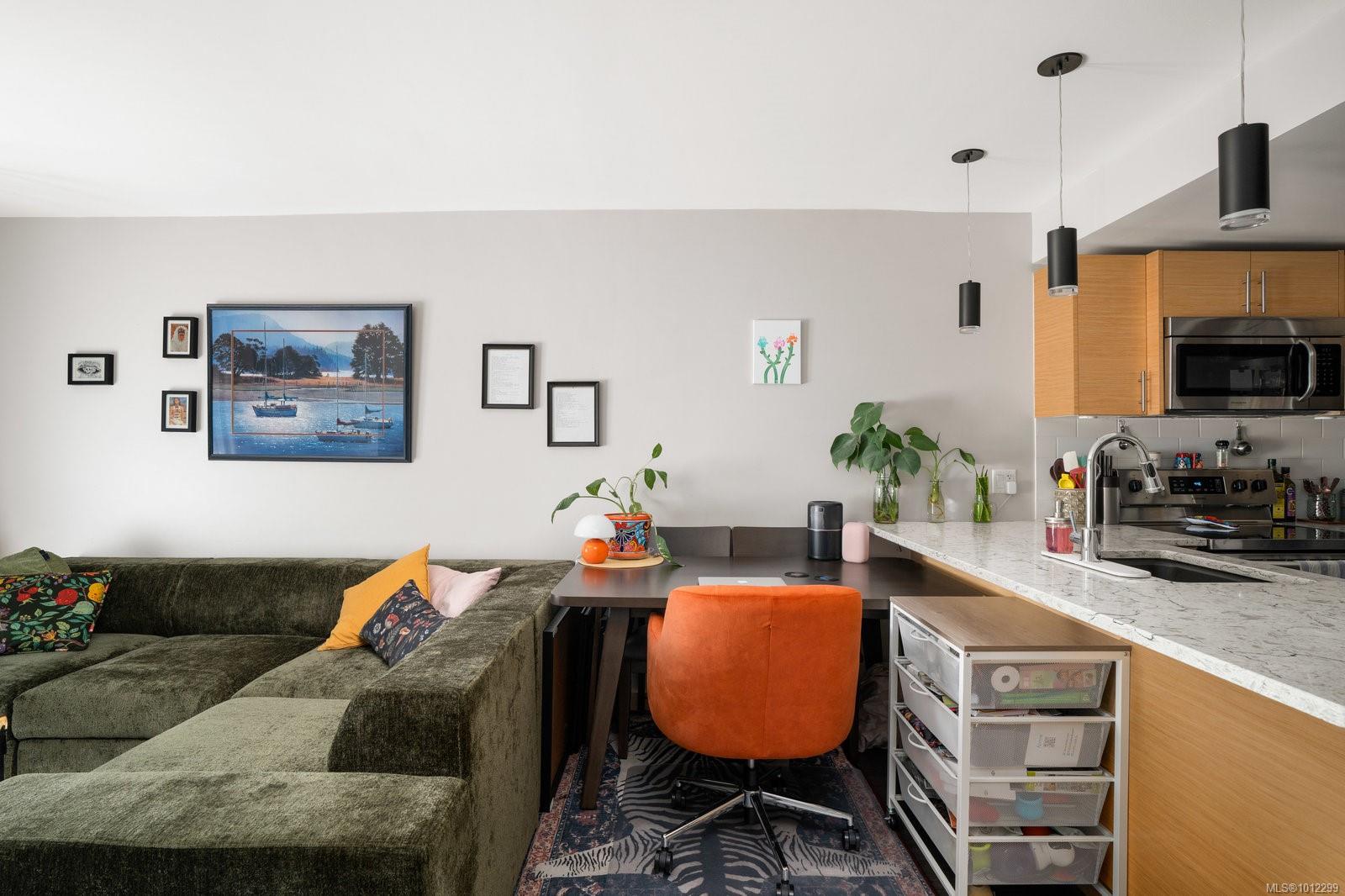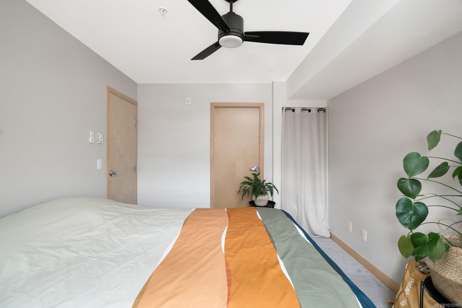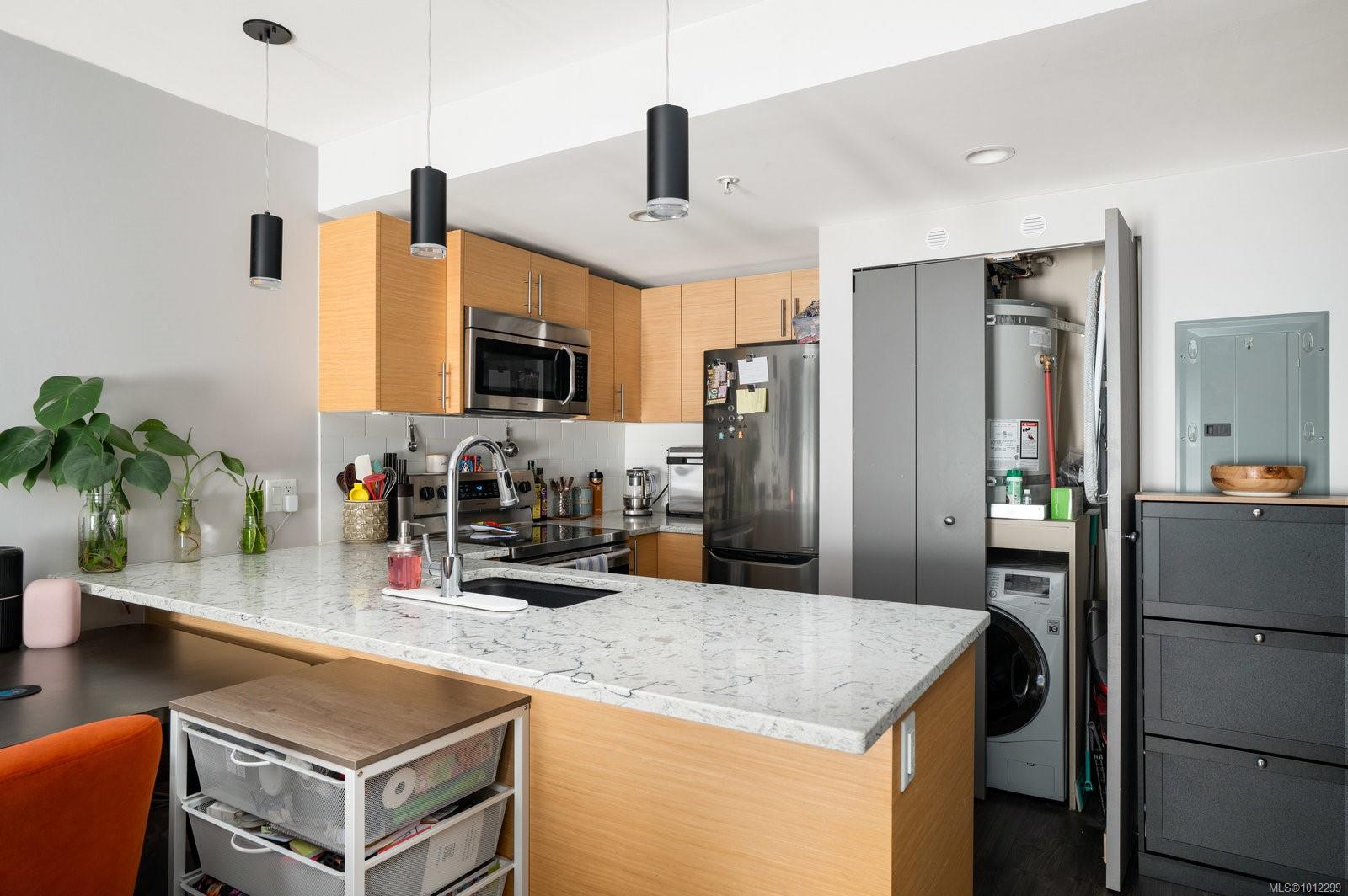 Welcome to the Railyards, one of Victoria's most sought-after waterfront communities. Nestled along the Gorge Waterway and Galloping Goose Trail, this 1-bedroom condo is a dream for outdoor enthusiasts. The condo's open concept layout features numerous upgrades, including LED lighting throughout, vinyl plank flooring, quartz kitchen countertops, bathroom vanity and both new carpet and Kendal dual direction fan/light combo in the bedroom. The spacious blended living/dining room offers great natural light, while the generous bedroom includes a cheater door to access the bathroom, featuring a relaxing soaker tub. Additional perks include in-suite laundry, a storage locker, and bicycle storage. Pet friendly, rental friendly, and just a short walk to downtown, this home offers the perfect mix of tranquility and urban access in one of Victoria's best locations.