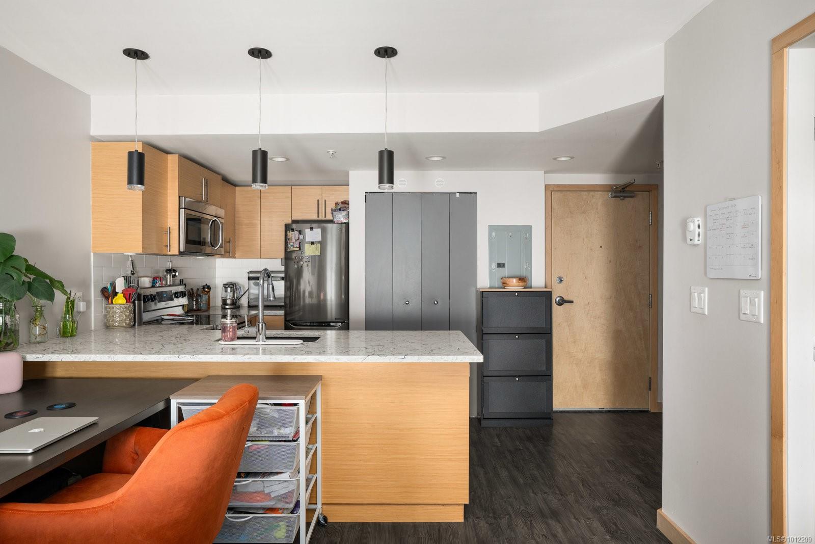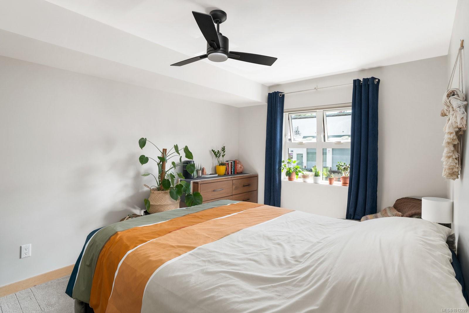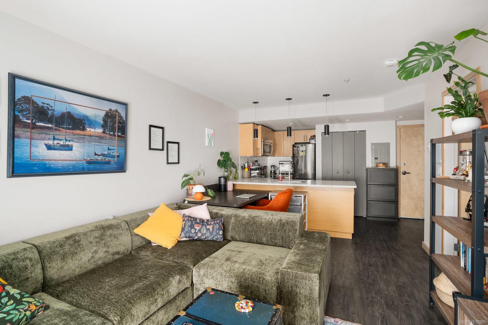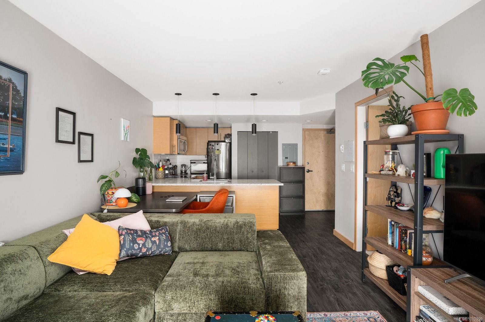 Welcome to the Railyards, one of Victoria's most sought-after waterfront communities. Nestled along the Gorge Waterway and Galloping Goose Trail, this 1-bedroom condo is a dream for outdoor enthusiasts. The condo's open concept layout features numerous upgrades, including LED lighting throughout, vinyl plank flooring, quartz kitchen countertops, bathroom vanity and both new carpet and Kendal dual direction fan/light combo in the bedroom. The spacious blended living/dining room offers great natural light, while the generous bedroom includes a cheater door to access the bathroom, featuring a relaxing soaker tub. Additional perks include in-suite laundry, a storage locker, and bicycle storage. Pet friendly, rental friendly, and just a short walk to downtown, this home offers the perfect mix of tranquility and urban access in one of Victoria's best locations.